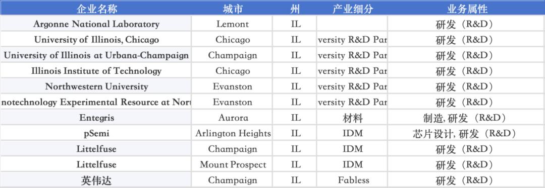 Illinois 依托 Argonne National Laboratory、University of Chicago、University of Illinois 系列高校,在 Entegris、pSemi、Littelfuse 等企业带动下,形成材料、射频器件与功率器件并行的格局;