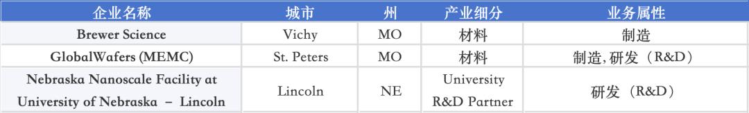 Missouri 与 Nebraska 侧重材料与大学科研,例如 GlobalWafers(MEMC)、Brewer Science 以及 University of Nebraska–Lincoln,为美国本土提供一部分硅材料与涂层技术供应。